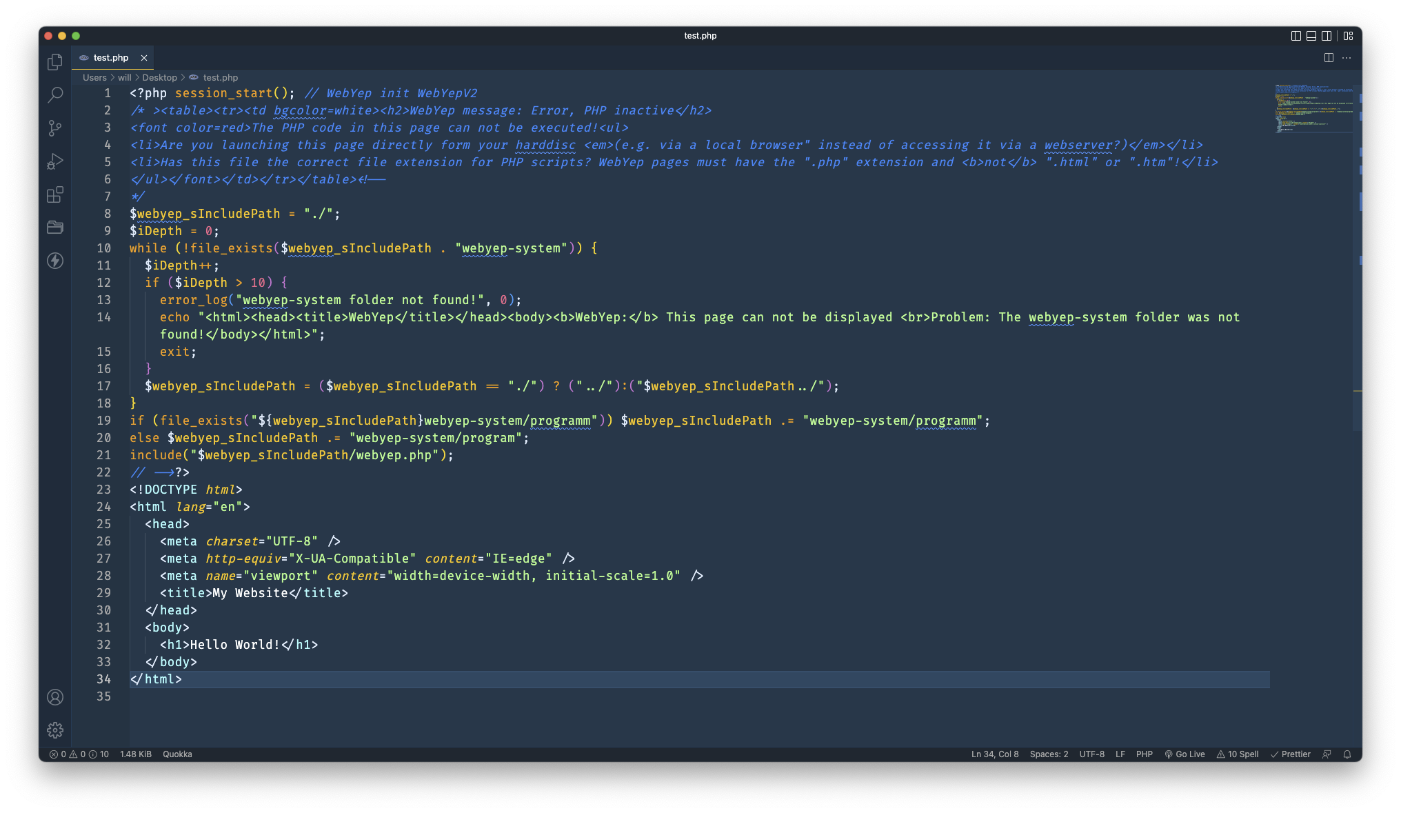 'Init' is an acronym for 'initialization', and every web page you want to edit using WebYep needs this. This code must be located at the very beginning of the document, before anything else. There must not even be an empty line or space before it.